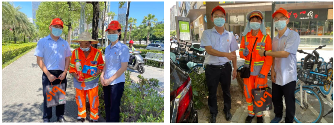 百立勤总部各职能部门组成现场的公益小组,并分组一对一到深圳宝安区及南山区环卫工人劳作一线送去夏日里一份特殊的“清凉”,把一份份装满爱心与祝福的降暑物资直接送到了作业在一线的环卫工人手里。并嘱咐他们在辛勤工作的同时注意防暑降温,保重身体。